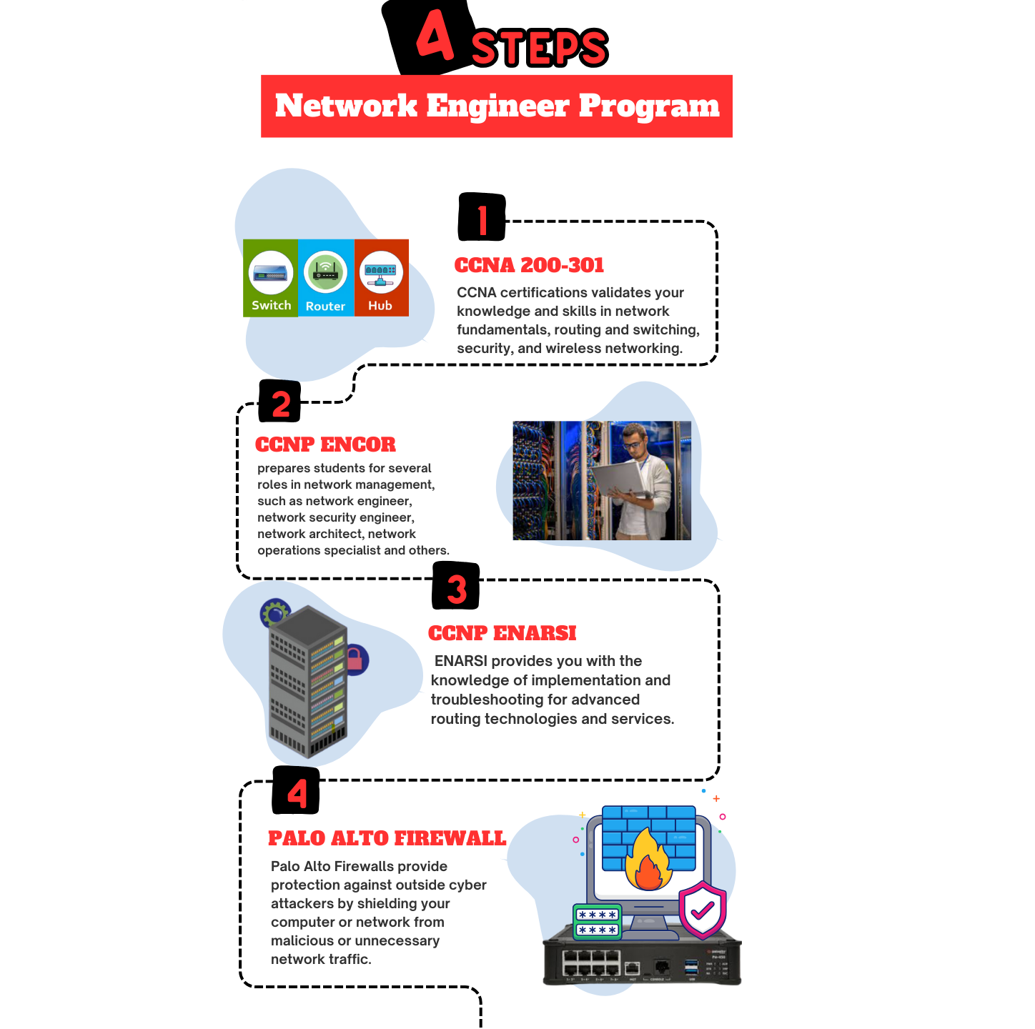 "Our Network Engineer program curriculum features training in CCNA, CCNP ENCOR, CCNP ENARSI, and Palo Alto Firewall. Designed by industry experts, it covers networking, security, and cloud computing essentials, providing hands-on experience with Cisco & Palp Alto equipment. Participants learn to design, implement, and troubleshoot networks, gaining valuable skills and certifications for success in IT."